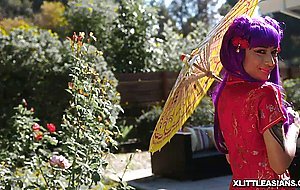 Avery in a sexy red drees is gallivanting around a beautiful garden. But Avery is not looking for new flowers. She is on the hunt for a big tree trunk to stick inside her yummy Asian pussy! She gobbles his yard stick and then bounces on his dick while he holds her up. This is one hella horny chick