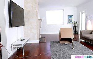 A petite teen thief was caught in a trap set by her tall neighbor.She begs him not to call the cops and that will do anything in return.The guy carries her upside down and makes her suck his bigcock.Afterwards he throws her to the couch and fucks her