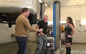 A horny mechanic ends up sharing his slutty little escort with an anal enthusiast.