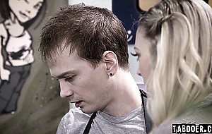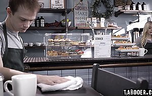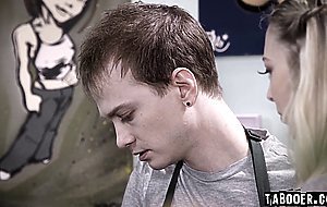 Chrissy is challenged to change her uptight behavior towards her boyfriend Josh when she learned that he cheated on her. She asked for a chance to prove that she can be exciting and started to give Josh a blowjob under the counter during their work, making Josh excited for her bold move.