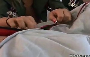 Camp counselors Allyssa and Kacey just finished their shift and were bored and wanted to have fun! The two then decide to pay a visit to Scott, another counselor in the next cabin that they find cute. The two girls double teamed Scott and he fucked these two till they couldn't take anymore!Fun day on the job!