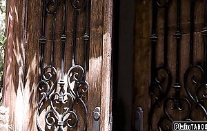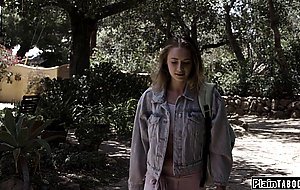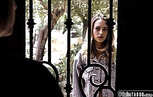 New foster girl shows the guy that she will fit in by having him lick and fuck her shaved pussy.Big daddy walks in and takes over.He kisses the small tits petite babe and facefucks her with his big cock.The brunette rides dick while sucking