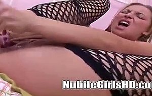 Daria is one very hot teen babe and those nylons are enough to make a guy go crazy. She is out of her top really quickly, showing off her perky little tits before exposing that gorgeous bald pussy to the camera. Once she is good and horny she uses a thick glass dildo with purple nubs to make her snatch sing.