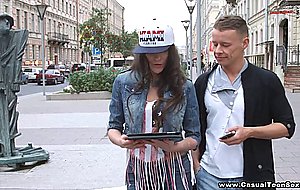 This curly teeny is new in town and luckily there's a handsome stranger passing by who is more than willing to show her around. Sure enough, the guy first shows her the way to his own apartment and she doesn't mind having some casual fun right on the floor. Yeah, girl! Take that cock in your mouth and pussy like a welcoming gift from the whole community. Enjoy your stay and take home a special souvenir, hot cum smeared all over your pretty face!