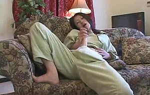 Naughty japanese hermaphrodite plays with her hard futa cock on the couch.