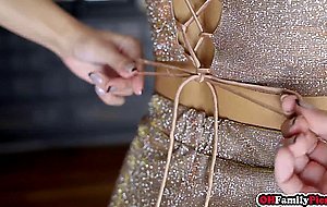 Petite latina teen stepsister Vanna Bardot with small tits in sexy dress with high heels seducing her stepbrother to celebrate the new year on his big cock She tastes the huge meat before he fucks the trimmed pussy hard