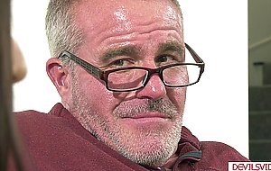 A brunette teen flirts with her bestfriends grandpa.She takes her clothes off then rubs her pussy in front of him.The old guy grabs her,kisses her then have her suck his cock.Then he eats her shaved teen pussy before fucking her hard as she rides him