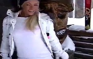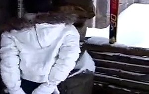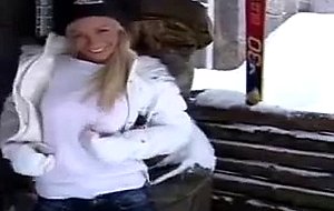 Our girls simply cannot get enough of this wintry weather. Our Sharon for instance was up at dawn to fly down the steep slopes of the hills on her ski's. Well, that was the original idea at least. But something got in the way: Her horny pussy!