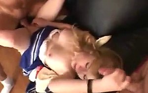 Innocent blonde cheerleader in threesome fucked and doing bj