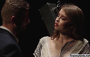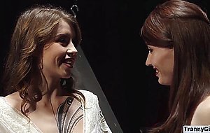 Tattooed ts Natalie Mars have fum with straight guy and sexy female friend Eden Ivy in couch wearing black leather fetish lingerie. They take turn oral sex with lots of blowjobs and pussy lickign before the tbabes ass gets anal bareback in threesome.