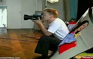 A young couple enters a photo studio where clothes are laid out on a large bed. A little later the girl is posing topless while the guy is taking pictures of her. Then she is on her hands and knees while the guy is fucking her from behind until her comes in her mouth.