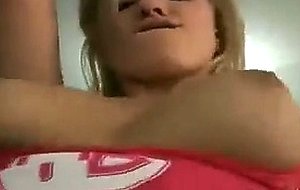 A teenage girl wearing only a T-shirt and panties is in the gym. She squeezes her large boobs, showing them to the camera. Then she takes her panties off and rubs her pussy. Finally she fucks herself with a dildo, rubbing her clit at the same time.