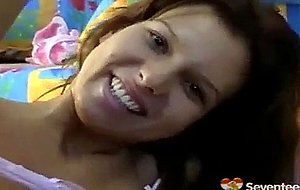 A teenage brunette wearing only her undies and a see through blouse is sitting on the couch. She masturbates using a vibrator, slowly taking the rest of her clothes off. Laying down on the floor she continues to fuck herself with the vibrator.