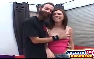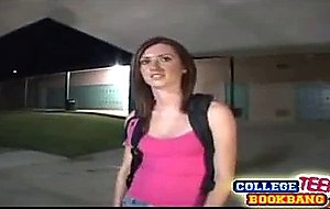 Brunette college babe grabs cushion when her teen pussy rides a cock