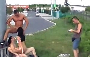 Whore in honey public threesome
