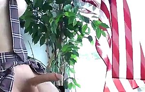 Schoolgirl ladyboy masturbating on couch