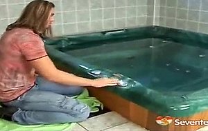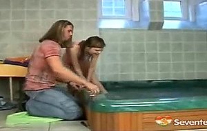 A guy is fixing something on an indoor pool when a young girl walks in and steps into the water. He takes his trousers off and shows her his hard dick. She sucks it shortly and then the both of them get into the water for a long fuck.