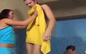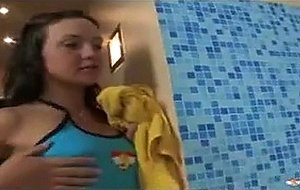 A teenage girl is watching two guys who are playing in a swimming pool. SHe is stroking her breasts through the material of her shirt. When the guys get out of the water she gives both of them a blow job before they fuck her in turns.