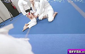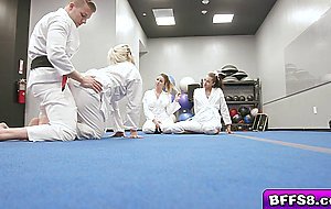 Abigail Peach Bella Rolland and Olivia Grey make their move licking and sucking their senseis fat cock in the middle of the dojo They share his prick while they film He pummels their cunts one at a time showing them the meaning of physical discipline