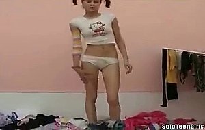 Mixed in with the clothes are a few extra toys that Sally to make use of. No problem there, she picked out a red vibrator and it on her pussy.
