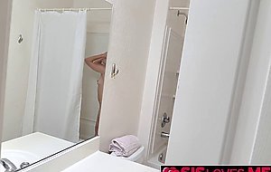 Brothers nerdy sister is taking a shower and he cant help to peep in. Aften catches him and tell him to use his cock for good reason. She bend over the bathroom sink while Brother stick his cock hard from her behind