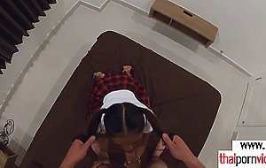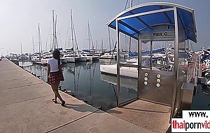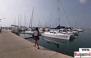 Skinny brunette amateur Thai teen Cherry with small tits in sexy schoolgirl uniform walking on the pier with her european lover The fresh air makes her horny so she takes his big white dick at home and asks him to fuck her hard after a blowjob