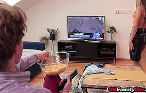 Serina Gomez changing clothes in front of stepbro and lusts for his dick because he does not pay attention to her body Teen dressed sexy clothes and came in guys room She started with massage and gave him a blowjob After oral she finally got fucked by him