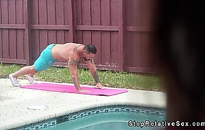 Brunette teen Violet Gems gets horny while watching her shaped stepuncle GI Joey workout in backyard by the pool and then sucks and fucks his big cock