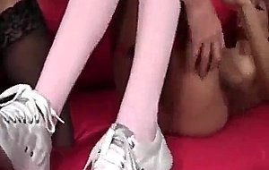 Stockinged cougar licking her teen gfs pink snatch