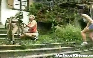 Nothing is more fun than a ride on horseback through the forest but with our budget we will have to make do with a wooden horse... Mind you, Mellie and Cynthia know quite a lot of other ways to entertain each other, horse or no horse...