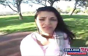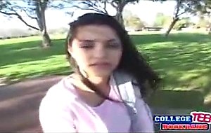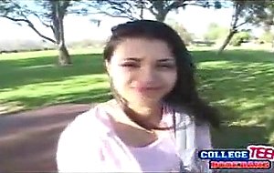 Cute brunette teen gets on her knees to suck a huge dick