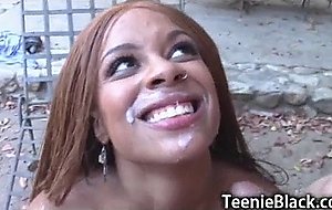 Teeny black girl rides a big white dick and takes a messy facial cumshot outdoor for money!