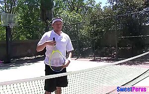 Redhead teen Kendra Cole with small tits preferring sex than tennis so she seducing and fucking her trainer next to her curious GF outdoor who recording the hard fuck