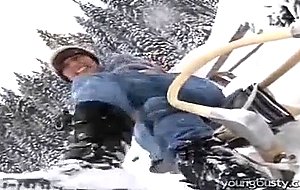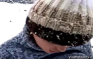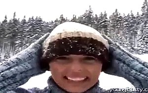 A young girl is riding her sleigh in the snow. When she gets tired she lifts her jumper, revealing her giant tits. She drops her pants and strokes her pussy, rubbing it vigorously. When she is nearly naked she gets out a vibrator and shoves that all the way into her cunt, masturbating until she comes.