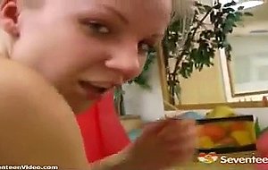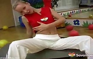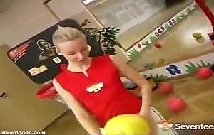 A blonde teenage girl in a training suit is in the gym, playing with a ball. She rubs her tits and her pussy through the material of her clothes. A little later she is naked and fucking herself with a dildo in various positions.