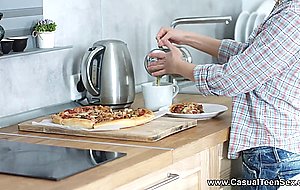 This guy loves Pizza, but Cornelia's sweet young pussy tastes even better. Ain't that great grabbing a slice and then licking fresh juicy pussy for dessert, then fucking a gorgeous blonde teeny right on a dinner table and giving her a mouthful of cum. She grabs another slice of Pizza and eats it right there with hot jizm still dripping down her cheeks and chin. Wow, what a crazy fucking breakfast for a couple of casual sex lovers.