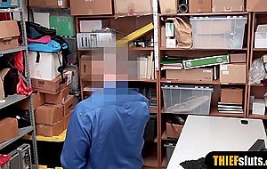 Petite redhead teen jewelry thief April Reid with small tits and nice tattooes got caught and pays with her pussy to avoid jail