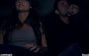 4:38Sexy brunette teen Kenzie Vaughn drove by bf James Deen and his friends in woods at night and in human bondage rough double penetration fucked by big dicks