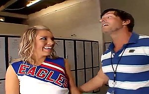体格の良い柔軟なブロンドのチアリーダーが学校のコーチを誘惑する
