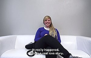 Katrina is a sexy blonde teenager with a thick eubstance, sucking her guy 's hard prick and getting her plump twat pounded hard .