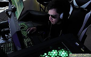 Kenzie crawls on her hands and knees and chokes on Juan's girthy dick. The distracted dickslinger continues to man the sticks as he shoves his meat pole deep inside his stepsisters tight cunt