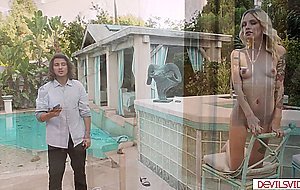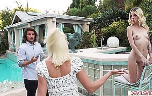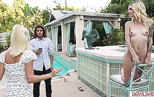 A teen babe seduces her stepsis boyfriend by stripping naked.The guy follows her to her room where she lets him fingering and lick her shaved pussy.The small tits blonde blowjobs his big cock then lets the guy fuck her hard while her stepsis is out.