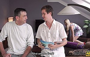 Nikki was cleaning her matte that day and dreaming about amazing day and sex with her boyfriend. She was wasting her sentence waiting when for her young man 's father to forget. Unfortunately, her beloved man fell asleep after yesterday 's party and his pappa was n't going anywhere ... Cleaning was done and Nikki wanted to sustain some fun at least. She was making funny selfies with her boyfriend 's father and her sleepy boyfriend at setting. They made a few photos and then decided to go a short bit further. flaccid osculation, touches lead them to wonderful sex close to her sleepy boyfriend, and a very bad pa was fucking his son 's girl passionately. We do n't know what that guy was dreaming, but when he woke up his life history became a nightmare, as no one would be happy to see his own girlfriend covered with their daddyÂs sperm ...