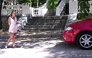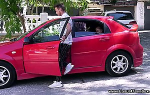 A guy almost hit this cute petite teeny with sexy tattoos on her thighs with his car, and guess what! He though the best way to show her how sorry he was would be eating her sweet young pussy and fucking her. Boy did he make her scream and cum so hard the neighbors must have called the police on them! His long thick cock kept piercing her again and again and finished with a messy facial she gladly took like a well-fucked whore.
