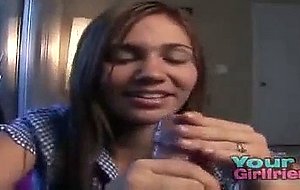 Cute giggly teen girlfriend lubes up her hands and strokes her boyfriends cock and we get a POV video of him blowing his load in her cute little hands.