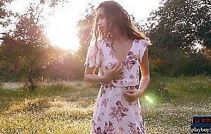 Petite body Filipina teen model Kit Rysha strips naked outdoor and poses in the grass while the sun is setting