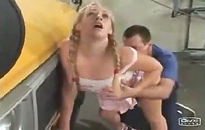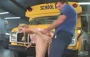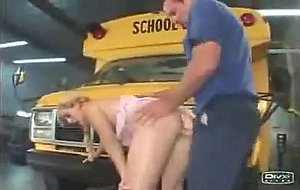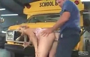 High School slut getting fucked by a horny School Bus Driver and rides his cock in a School garage.