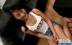 Asian innocent babysitter Evelyn shows off her tiny tits and clit