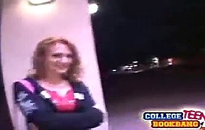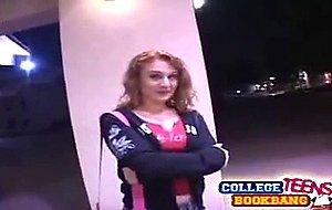 Redhead coed gets on her knees to open her teen mouth for a hard dick