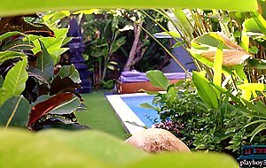 Ukrainian teen Clarise shows off her petite tight body outdoor for Playboy She then hops in the pool and relaxes taking in some sun! This tiny model had really small tits and a tight shaved pussy which we get to see nicely as she gets naked!